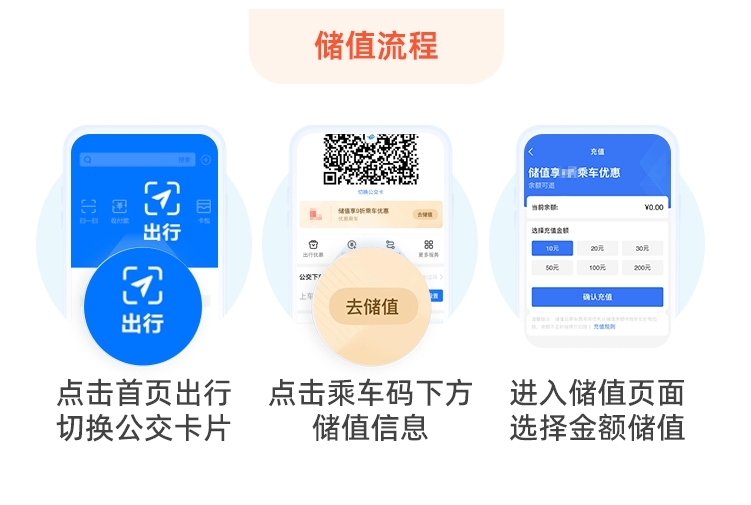 5.如何使用公交儲(chǔ)值優(yōu)惠券:已領(lǐng)券用戶點(diǎn)擊支付寶首頁(yè)-出行,已開(kāi)卡用戶可點(diǎn)擊乘車(chē)碼下方儲(chǔ)值按鈕,進(jìn)入儲(chǔ)值頁(yè)面,儲(chǔ)值金額大于或等于50元,即可享受儲(chǔ)值立減優(yōu)惠。