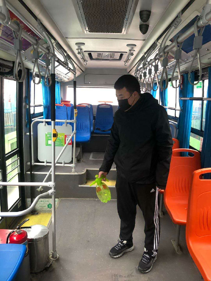 出車前的疫情防控培訓(xùn),他囑咐大家時刻繃緊弦兒,疫情之際,發(fā)車之前都要準備好、肩負起一系列緊要而瑣碎的事務(wù)。羅霄將隨車消殺物品發(fā)放下去,同時與大家一起,對出場前的車輛里里外外進行全面的噴灑、擦拭消毒。他一邊忙碌一邊監(jiān)督,不放過任何一個死角和細節(jié),“特殊時期,這事兒不能馬虎!必須嚴格按照要求消毒,保證車上人員安全!