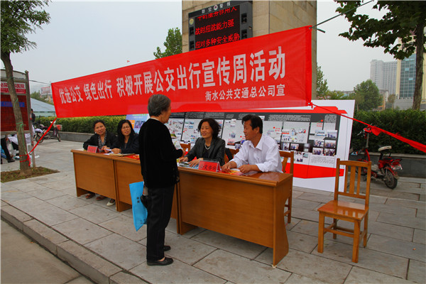 活動期間,緊緊圍繞“優(yōu)選公交、綠色出行”這個主題,結合衡水實際情況,開展了靈活多樣的群眾性主題宣傳活動。一、利用車載媒體及LED廣告屏播放活動公益廣告片和宣傳語;在候車亭、首末站牌張貼公交出行宣傳海報;在火車站中心樞紐站、各大公園廣場等人流密集的地方設置“公交出行周”宣傳展板;在站務室、售卡中心懸掛宣傳條幅等綜合利用各種宣傳方式大力宣傳城市公共交通對保障民生、推進節(jié)能減排、減少空氣污染、緩解城市交通擁堵的重要意義,積極引導市民支持和參與城市公共交通發(fā)展。二、組織辦公室、政策研究室、售卡中心、人事勞資科、營運服務科等相關科室在火車站中心樞紐站、各大廣場、大型換乘站臺等公共場所設立公交咨詢臺,宣傳公交并解答市民關于公交IC卡優(yōu)惠政策、公交司機招聘、線路運營、公交政策等方面的問題。同時,制作并發(fā)放了“征求意見卡”,以此來廣泛征集市民對公交線路優(yōu)化、服務時間、班次密度安排、車廂衛(wèi)生狀況、司乘人員服務態(tài)度等方面的意見和建議,為提升公交服務質量和乘客滿意度征集寶貴的第一手資料。三、加強輿論宣傳報道。活動期間邀請衡水廣播電視臺、衡水交通廣播臺等新聞媒體的記者同志們到現(xiàn)場實地報道“公交出行宣傳周”活動實施情況。通過各種新聞媒體報道,為“優(yōu)先發(fā)展城市公交”營造良好輿論氛圍。四、結合“百日優(yōu)服競賽”“衡水湖馬拉松比賽用車優(yōu)服培訓”等活動,積極開展形式多樣的服務質量、服務技能競賽和崗位練兵活動。