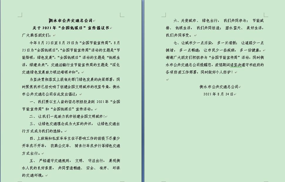 低碳出行倡議活動(dòng)。總公司以8月23日至29日“全國(guó)節(jié)能宣傳周”為契機(jī),在公司內(nèi)部開(kāi)展少用一張紙、節(jié)約一度電、做好垃圾分類(lèi)等活動(dòng),并利用“衡水公交微信公眾號(hào)”向社會(huì)發(fā)出“衡水市公共交通總公司關(guān)于2021年全國(guó)低碳日宣傳倡議書(shū)”。