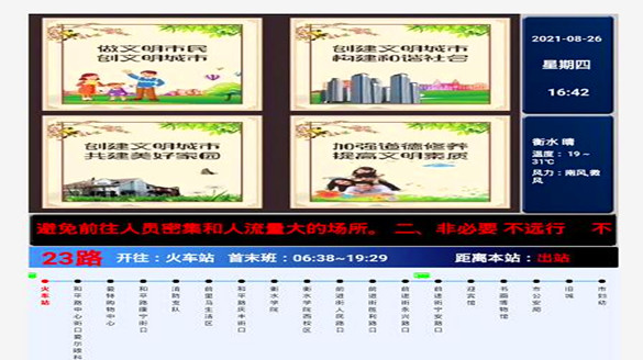 公益廣告提升活動(dòng)。近日,總公司對(duì)公交關(guān)于廣告宣傳內(nèi)容進(jìn)行了全方位整改提升,截至8月27日,公交站亭更換公益廣告73塊,共建小區(qū)更換公益廣告2塊,210余部公交運(yùn)營(yíng)車(chē)輛車(chē)載節(jié)站屏更新公益廣告內(nèi)容,450部運(yùn)營(yíng)車(chē)輛安裝文明禮讓宣傳展板,火車(chē)站10座電子站牌全部更新公益廣告內(nèi)容。