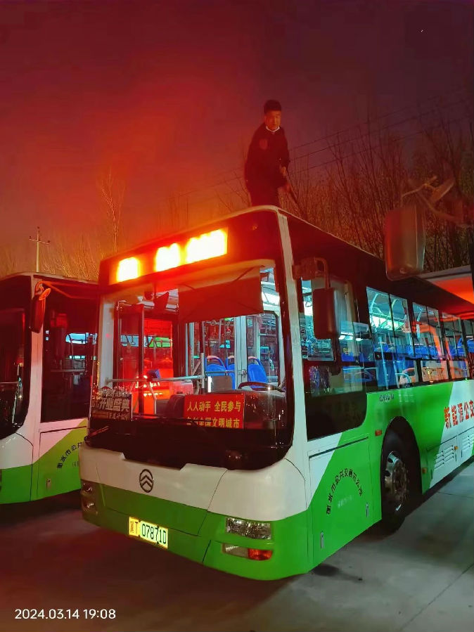 加強(qiáng)公交站亭巡查維護(hù)及公交車輛保潔力度,及時發(fā)現(xiàn)并維護(hù)站亭設(shè)施、清理小廣告等問題;運(yùn)營中“半趟一巡視,一趟一清理”,保持公交車輛內(nèi)、外環(huán)境整潔。為乘客提供舒適整潔的候車、乘車環(huán)境。